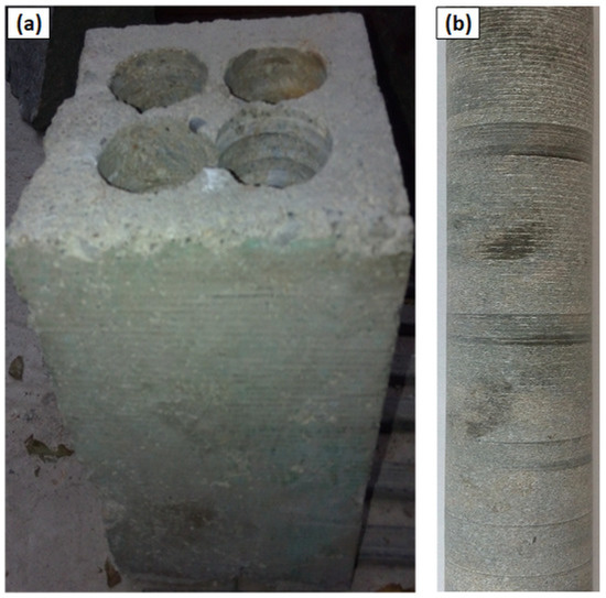 Result of practical drilling in laboratory conditions ((a) block-shaped rock sample with boreholes, (b) drilling rock core).