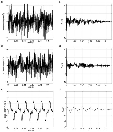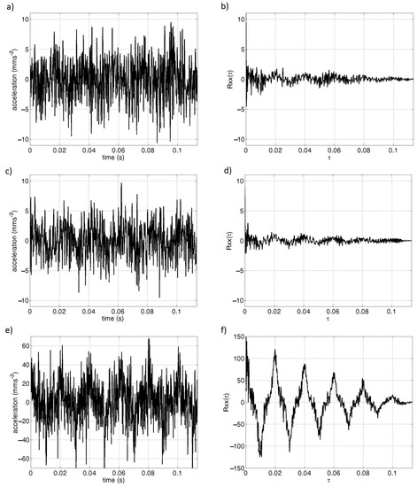 From the time waveform of the autocorrelation function, it can be said for practice that the faster the autocorrelation function decreases for increasing [38], the smaller the statistical dependence of the signal’s successive values and the signal will also cover a broader frequency spectrum. The slower time waveform of the autocorrelation function is characterized by more significant statistical dependencies of successive signal values and greater system inertia. If the signal contains a periodic component, the autocorrelation function has the same period as the signal.
