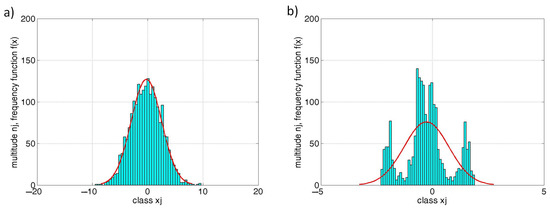 Figure 8a shows a histogram with a normal Gaussian distribution. It characterizes the operating modes in which the main vibration generator is the motor (i.e., modes I., IV., V., and VII.–IX.). For modes without motor operation (i.e., II., III., and VI.). The characteristic histogram in the figure is Figure 8b. It can be classified as a two-vertex histogram or a histogram with a non-Gaussian distribution. It indicates a superposition and a significant change in the position of the measured signals [57,58].
