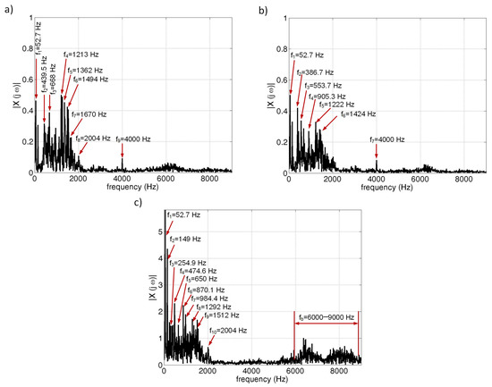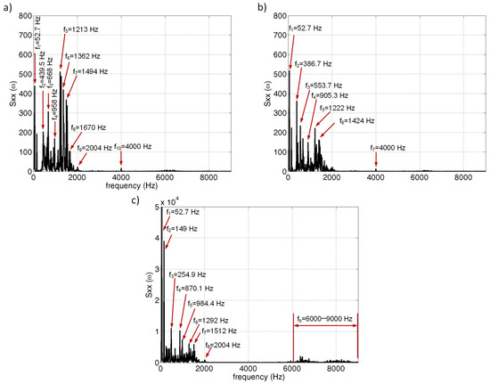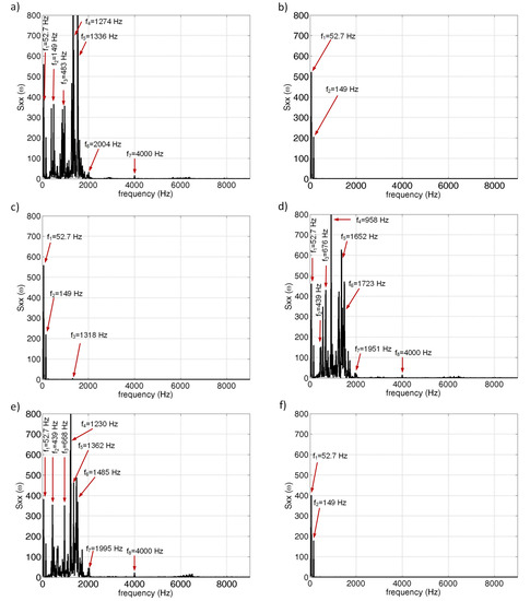 In industrial practice, power spectra are also calculated in addition to amplitude spectra [46,47]. In some complex industrial processes, in which signals are generated, they have a stronger informative value about the current state of the technological process [48,49]. The following equation was used to calculate the power spectrum: