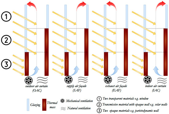 10], and outdoor air curtain, have proven their ability to contribute toward improving the thermal efficiency of buildings when they are integrated into their envelope (