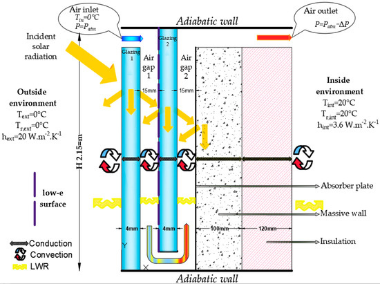 Figure 2. This comprises (from outside to inside) an outer glazing in contact with the exterior environment, an outer air gap, a second glazing with a low-emissivity coating on the outer side, an inner air gap, a massive wall, and insulation. The two air gaps form a U-shaped channel. Fresh air enters the southern-facing solar wall through the inlet opening located at the top of the outer pane at a temperature equal to that of the outdoor air. It flows down into the first air gap delimited by the two glazings and then flows upward into the second air gap delimited by the glazing and the storage wall. The solar energy absorbed by the two panes and mainly by the concrete massive wall is transferred to the fresh air passing through the ventilated cavities. The air is also preheated by recovering part of the heat loss from the interior. The thermal energy stored in the form of sensible heat in the concrete massive wall is used to meet energy needs at night or during cloudy daytime periods. Preheated air enters the building through the outlet opening at the top of the opaque layer with an unknown temperature. The flow of air at a low speed in the solar wall is induced by the depressurization of interior spaces by mechanical means. The glazing with a low-e coating prevents heat from re-radiating to the outside, thus improving the performance of the VSW by taking advantage of the greenhouse effect during the day and reducing losses to the outside at night. A black heat-absorbing material is installed on the exterior surface of the massive wall to maximize the solar energy absorbed by the latter. Both the upper and the lower horizontal surfaces of the VSW are treated as adiabatic.