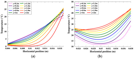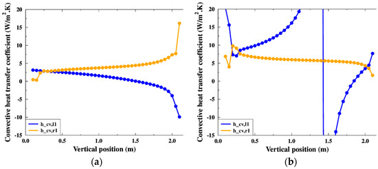 It is noted that, in the upper section of the outer air gap, the local convective heat transfer coefficients between the channel’s left surface and the air were negative. This does not make physical sense. In fact, we did not follow the basic definition of the convective heat transfer coefficient equation where the fluid temperature was that of a fluid sufficiently far from the surface, but we used the definition of the bulk air temperature. The convective heat flux relative to this surface was positive, while the temperature difference was negative.
