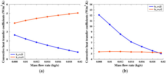 Figure 8 shows the evolution of the heat transfer coefficients as a function of mass flow rate. For the outer air gap, as the mass flow rate increased, the convective heat transfer coefficient on the left (l) side decreased, while that on the right (r) side increased. For the second air gap, when the mass flow rate increased, the convective heat transfer coefficient towards the left side decreased, while for the right side it was almost stable. The same appearance of the curves was found as for the Paziaud window [