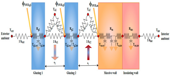 Figure 11 shows a representative diagram of the solar wall through an electrical analogy. The diagram shows the different surface nodes used and the different flows considered. On each node, the heat balance equation is solved and includes heat transfer due to convection, conduction, and radiation.
