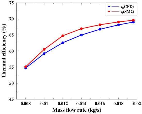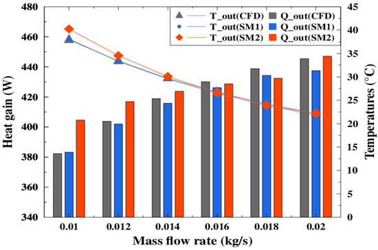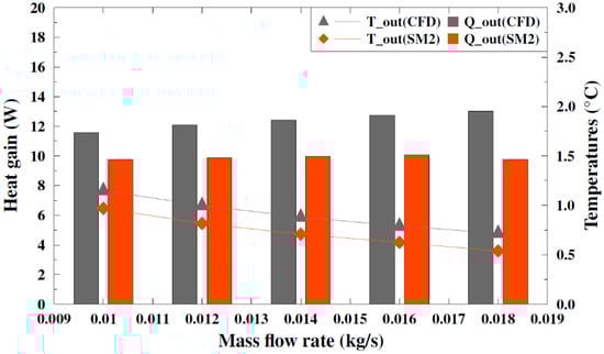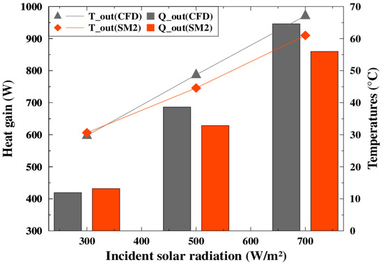 Figure 15 presents the simulation results for the heat balance as a function of incident solar radiation for both systems. Good agreement was found between the CFD model and SM2. The relative error for heat gain between the two models was less than 10%.