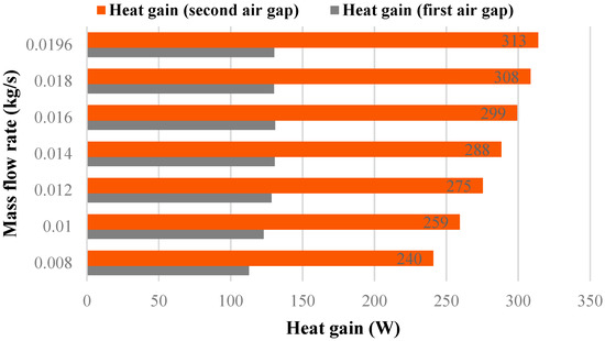 Figure 17. The results indicate that the heat flux gained by the air occurred mainly in the second air gap, and as the airflow rate increased, this effect became more apparent. Approximately, the first air gap accounted for only one-third of the recovered heat flow.