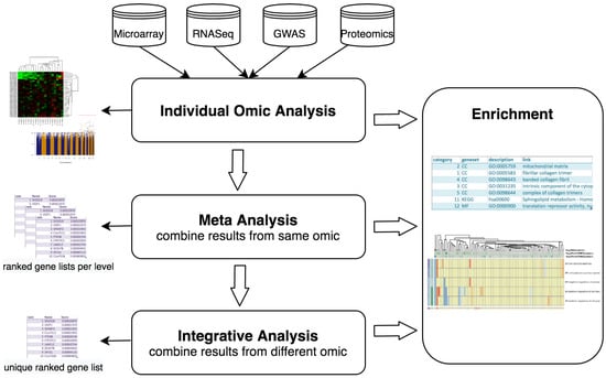 Integrative analysis: Integrative analysis aims at consolidating heterogeneous data at different omics levels to understand their interrelation and combined influence on the disease processes. This one-step protocol starts from the results of the meta-analysis from different studies, and ends with a unified ranked list of differentially expressed genes. It is performed using the Robust Rank Aggregation method [28]. It detects genes that are ranked consistently better than expected under the null hypothesis of uncorrelated inputs and assigns a significance score for each gene.