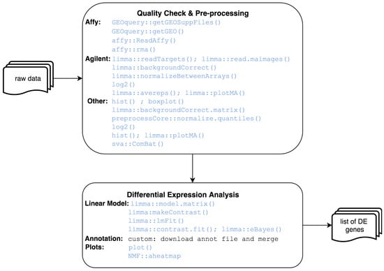 Genome Wide Expression Studies (GWES) from microarrays. RNA microarrays can simultaneously measure the expression level of thousands of genes within a particular mRNA sample [9]. This can be used to compare the level of gene transcription in clinical or biological conditions in order to find differences in expression levels between predefined groups of samples. This pipeline starts from raw expression data and ends with a set of differentially expressed genes, as shown in Figure 2. In order to capture these significant genes, the standard protocol to follow comprises data pre-processing, differential expression analysis (DE) and annotation steps. Pre-processing involves transforming raw data into a matrix of normalized intensities, using the RMA [10], limma [11] or preprocessCore [12] R packages depending on the data platform. Batch effect removal is also available through the combat function of the sva package [13]. DE is performed with limma, an R package based on linear models for microarray data, including optional correction for covariates, followed by annotation to translate probes to genes, using Entrez and Human Genome Nomenclature Committee (HGNC) identifiers. Additionally, heatmaps, PCA and volcano plots can be easily generated to assist the interpretation of results.