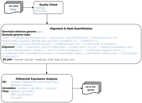 Genome Wide Expression Studies (GWES) from RNASeq. RNA-Seq is a particular technology-based sequencing technique which uses next-generation sequencing (NGS) to reveal the presence and quantity of RNA in a biological sample at a given moment. This pipeline starts from raw sequence reads, and ends with a set of differentially expressed genes (see Figure 3). The steps to complete this analysis are: quality check of the raw reads using fastqc [14], alignment of reads against the reference genome using STAR [15], quality control of aligned reads (by inspection of QC plots) and reads quantification with STAR. Differential expression can be then performed using DESeq2 [16], an R package based on a model using the negative binomial distribution, followed by annotation with biomaRt library [17]. As for microarrays, plots like MA, heatmap and PCA can be easily obtained.