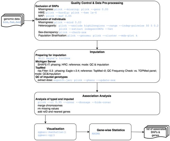 Genome Wide Association Studies (GWAS): GWAS is an observational study of a genome-wide set of genetic variants in different individuals to examine if any variant is associated with a trait. The GWAS protocol is available for genome builds GRCh37/hg19 and GRCh38/hg38, including the UCSC liftOver tools for updating genetic positions. This pipeline starts from genomic data in PLINK format, and ends with Single Nucleotide Polymorphisms (SNPs) annotated for surrounding genes and rs identifiers (dbSNP v150 for the GRCh37 pipeline and dbSNP v151 for the GRCh38 pipeline), which are then aggregated to the level of whole genes, testing the joint association of all markers in the gene with the phenotype, as depicted in Figure 4. Procedure followed here is a composition from Anderson et al. protocol [18] and AT Marees et al. [19]. Steps are: initial quality control excluding bad quality individuals and SNPs, genotype imputation using the Michigan [20] or TopMed [21] imputation servers, case control association study using PLINK [22] and gene-wise statistics computed using MAGMA [23]. SNP level data can be visualised with Manhattan and QQ plots [24].