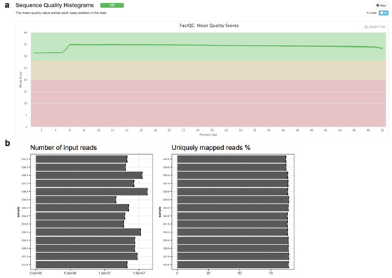 NGS quality plots generated by MultiQC integrated in MOMIC. (a) Sequence Quality Histograms, (b) number of reads.