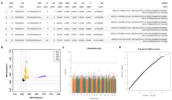 Tabular and graphical outputs from GWAS. (a) top annotated SNPs. (b) Multidimensional Scaling plot for population stratification. (c,d) Manhattan and QQ plots.
