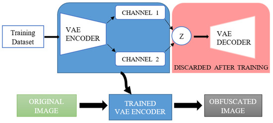 The first step of our method is to train a convolutional VAE on another dataset from the same domain as the working dataset. Additionally, one of the layers is used for noise addition. At the bottleneck, the information is divided between two channels to obtain an encoded version of the input. Those channels correspond to the mean (channel 1) and standard deviation (channel 2) of the normal distribution obtained from the encoder. Any of the channels can then be used for a subsequent DL model training on obfuscated images. From the trained VAE, only the encoder is retained as a black-box obfuscation tool. As there is no need for a reconstruction once an image has been obfuscated, the decoder is discarded. Figure 1 displays the workflow described for the obfuscation method based on a VAE.