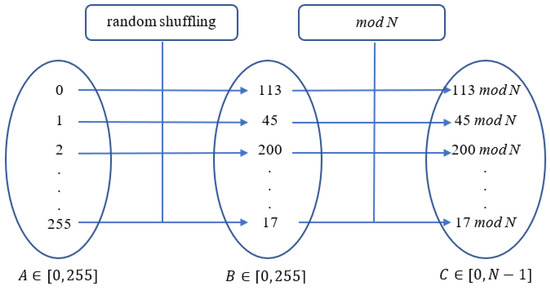 This approach starts with a simple obfuscation technique—random pixel intensity shuffling. Every pixel intensity is randomly associated with another value from the same interval as described by Equation (4), where is a function that returns all integer numbers between a and b, including the interval’s endpoints, and is a function that randomly interchanges the positions of the elements of a list x inside the returned array. We call this array a map because it creates connections between each possible pixel intensity embodied in the list of indexes of the array and a new random value contained in the array at the corresponding position.