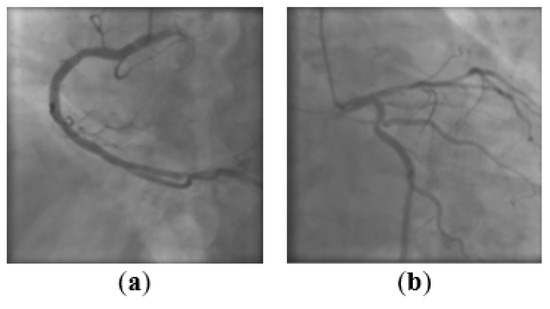 The task is to train a binary classifier to distinguish between RCA and LCA views in angiographic frames. Figure 7 depicts one sample of each category. The dataset contains 3280 coronary angiographies, balanced between the two classes. A subset of 600 images is used for validation, and another subset of 700 images is retained for evaluation purposes. The rest of the 1980 angiographic frames are used for training. Augmentation techniques such as shifting, flipping, zooming and rotation are applied. The original size of the frames is 512 × 512 pixels, but experiments with different input shapes have shown that a size of 128 × 128 ensures almost no loss in classification performance with a lower computational time. The pixels values are normalized through min-max scaling in the [0, 1] range.