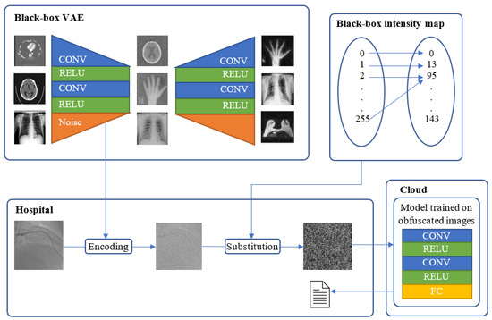 The first stage is to train a variational autoencoder, which uses the original (non-obfuscated) dataset as both input and target, and provides an obfuscated counterpart for each sample at the bottleneck. A detailed description of the VAE architecture, training and obfuscation process is presented in Section 2.1. The next step is also described as a stand-alone method in Section 2.2, where every pixel intensity value is randomly translated to another intensity value in a non-bijective manner, to alter the visual information. When the techniques are used in conjunction, the image encoded with the VAE is further obfuscated through pixel substitution, according to a non-bijective mapping function. The entire workflow is detailed in Section 2.3. The clinical usage scenario, the dataset, and the architecture used to solve the classification task are presented in Section 2.4. Section 2.5 describes the procedures employed to evaluate the privacy level provided by the proposed approach against human perception and against AI-based reconstruction attacks.