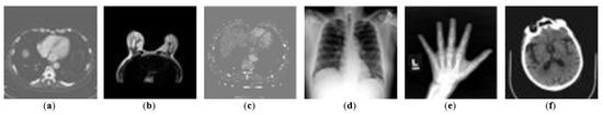 Medical MNIST samples: abdomen CT (a), breast MRI (b), CXR (c), chest CT (d), hand radiography (e), head CT (f).