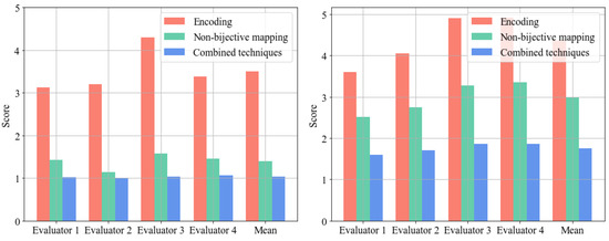 The results of the manual evaluation for all three obfuscation approaches are depicted in Figure 17. The mean scores regarding vessels and background reconstruction quality are displayed for each evaluator, alongside the average value. While similar scores were attributed to both vessels and background reconstructions when only encoding was used, for the other two obfuscation approaches, the recovered background presents a higher quality compared to the reconstructed vessels. However, overall, we observe a decreasing trend when comparing the three employed techniques. Even if applying the non-bijective intensity mapping results in a significant privacy improvement, a further decrease in reconstruction quality is noticed when the techniques are used in conjunction.