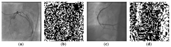 Regarding the classification accuracy, although its value is still above 80% when the obfuscation approaches are combined, which is acceptable in the context of a privacy-accuracy trade-off, there is still room for improvement. The purpose of the classification experiments is not to achieve state-of-the-art performance on obfuscated images but to compare the results when the same architecture and different obfuscation techniques are employed. Because the classification task can be successfully performed even when using small values of N, we sought to explore the existence of structural dissimilarities between the LCA and the RCA, which could allow for a superior reconstruction for one of the classes. Figure 18 depicts two different samples (one LCA and one RCA angiographic acquisition) and their dichromatic obfuscated counterparts. Although assigning the proper category solely by visually inspecting the binary images is difficult, it is clear that some characteristics are preserved even when , which allows for a relatively accurate DL-based classification. The scores given by the expert readers for LCA and RCA reconstructions are recorded separately, to see if such differentiating details allow for a more qualitative recovery for specific samples. In terms of vessel scores, there is no substantial difference between the two categories, according to the visual inspection. However, it appears that the background can be better reconstructed for RCA views.