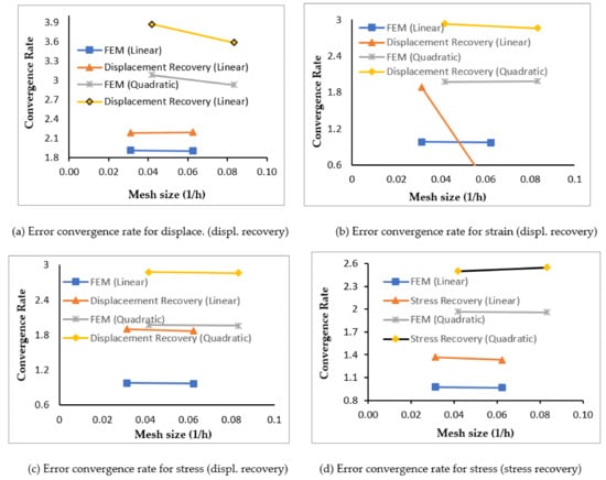 The error estimation quality results, i.e., error convergence and global effectivity in finite element solution, and recovered solution employing displacement and stress error recovery with increasing order of triangular element (regular/irregular) fineness, are given in Table 1, Table 2, Table 3 and Table 4. The finite element solution absolute errors of plate problem, i.e., the difference between the exact (or recovered) values of u (or σ, ε) and respective finite element analysis values, uh (or σh, εh) are computed using the Equation (7) and the solution errors are represented in L2-norm of stresses, displacement, and strains using Equations (8)–(10). Figure 3 depicts the rate of convergence of error at increased order of fineness, i.e., at 1/16 and 1/36 mesh size under displacement and stress error recovery procedures in linear and quadratic triangular elements.