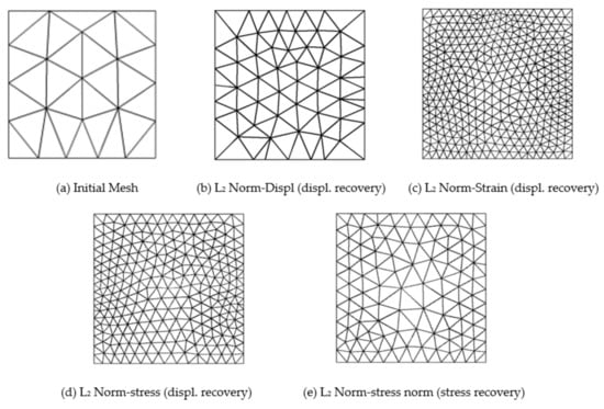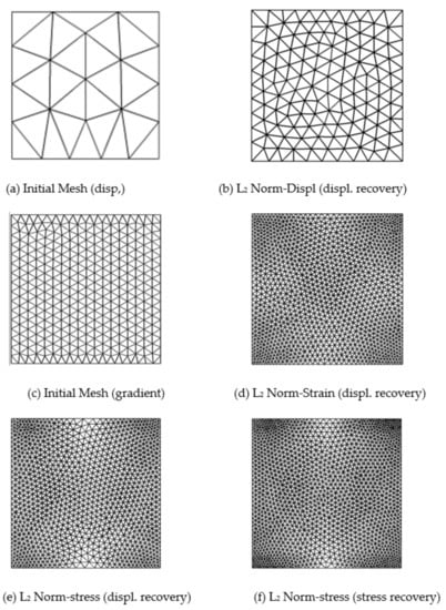 The adaptive analysis results are obtained for mesh required for target error limit for stresses, displacement, and strains. Table 6 and Table 7 show global errors (FEM and processed), the number of element (N), and degrees of freedom (DOF) in refined meshes, obtained from the linear and quadratic elements of the initial mesh, to bring accuracy to the target level. The required adaptive meshes for aimed accuracy in various L2-norms, namely stresses, displacement, and strains, using the least square stress, and displacement recovery-based error estimation for linear and quadratic elements are portrayed in Figure 4 and Figure 5.