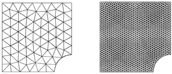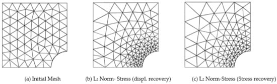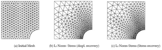 Due to symmetry, only the upper left square quadrant of the plate is modeled and discretized with linear and quadratic triangular elements (Figure 6). The error convergence with mesh refinement and global effectivity of error estimation using displacement and stress-based recovery technique for various domain discretization is given in Table 8. The finite element solution error is measured in stress-based L2-norm. The global errors (FEM and processed), and the required number of element (N) and degrees of freedom (DOF) for target accuracy using the linear and quadratic elements mesh are given in Table 9. The meshes required for predefined accuracy using the stress and displacement recovery-based error estimation for linear and quadratic elements are depicted in Figure 7 and Figure 8.