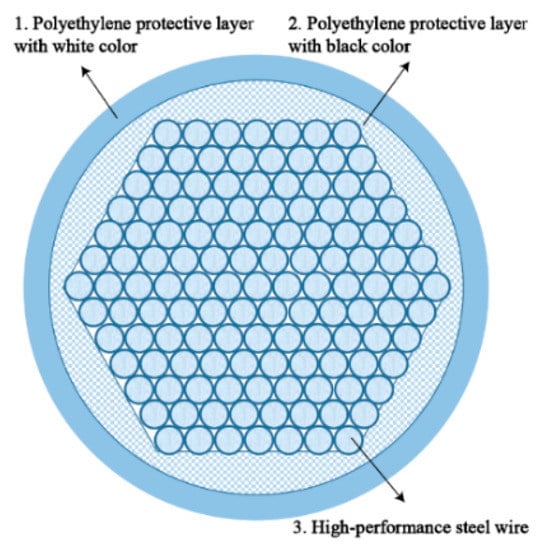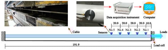 The proposed tension identification algorithm, based on TFR techniques, was verified experimentally using a workshop test. A cable of parallel steel wires was prepared in the test pit as the experimental sample, as shown in Figure 2. The experimental cable consists of 127 steel wires with a diameter of 5.2 mm per each and a double protective layer made of polyethylene, as shown in Figure 3. The length and mass per unit length of the experimental cable are 191.9 m and 22 kg/m, respectively. The detailed parameters of cables are shown in Table 1. The structural system had one fixed end and one end connected with a hydraulic jack. Several rubber rollers were placed under the cable to prevent it from being broken at low-level loads.