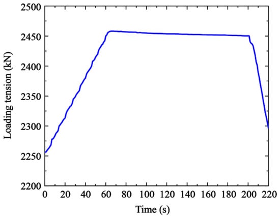 The loading process of the experiment was divided into three stages: loading, slow unloading, and fast unloading. The loading force was measured by the load cell, as shown in Figure 4. Firstly, the longitudinal loading tension increased gradually from 2255.8 kN to 2458.1 kN in 27 s. Then, the loading tension decreased with a slow unloading speed from 2458.1 kN to 2450.3 kN in 135 s. Finally, the loads drop rapidly to 2305.9 kN in 17 s.