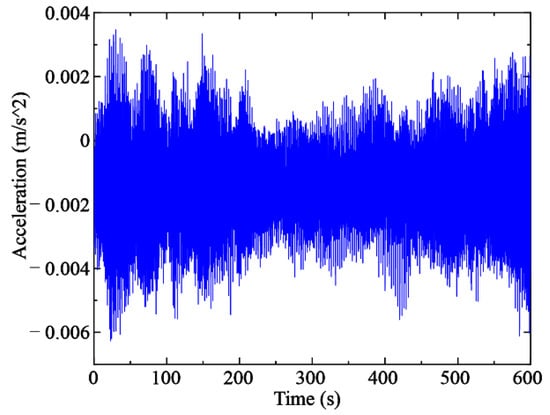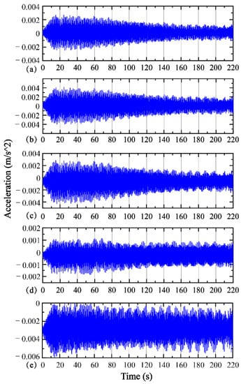 Using the accelerometers, the in-plane dynamic responses of the cable were collected, as shown in Figure 5. Except for the loads and environment noise, no other excitation force was applied to the structural system. Therefore, the acceleration conforms to free vibration with the amplitude of gradual attenuation.