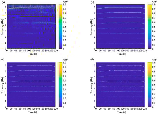 The length of the window function is an optional parameter in the TFR frame. Generally, the sampling point is selected as the nth power of 2 in order to ensure the convenience of the algorithm. In order to find an optimal window length, the time-frequency reassignment spectrogram  is calculated by different lengths, such as 64, 128, 256, and 512, corresponding to the sampling intervals 3.2 s, 6.4 s, 12.8 s, and 25.6 s, as shown in Figure 6. It is obvious to see from the figure that the time-frequency resolution of length 64 is very low, hard to extract the frequency along the time axis. The resolution becomes better when using 128 sampling points, but still represents a zigzag fluctuation in the time-frequency spectrogram, especially in the low-frequency region. Hence, the time-frequency resolutions of 256 and 512 are much preferable to the previous results. Therefore, the length of the window function is chosen as 256 in the time-frequency analysis.