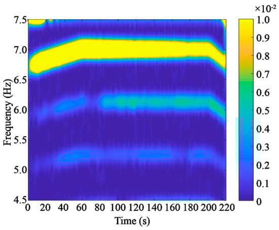 For comparison, traditional STFT analysis is also applied to deal with the acceleration signals. The STFT result is shown in Figure 8. The window function with the length of 256 sampling points, i.e., a time interval of 12.8 s, was used to extract the time-frequency characteristics simultaneously in the STFT frame. However, as mentioned in the introduction, the frequency resolution is pretty low if the length of the window function is short. Obviously, the time-frequency resolution is not as clear as the TFR-based algorithm shown in Figure 7. There is strong interference on the spectrum in Figure 8, so it can only roughly find the range of frequency distribution.