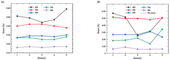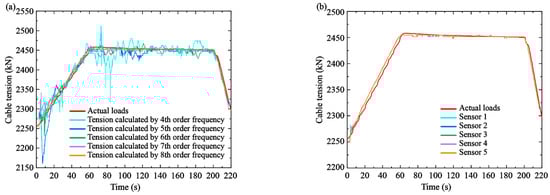 The proposed algorithm then processed the identified 4th to 8th frequencies to calculate the tension by Equation (12). The results are shown in Figure 9a. By comparison, the actual loads are also marked with red color in Figure 9a. The tension calculated by the low-order frequencies changes more than the higher-order frequencies. Meanwhile, each sensor identified the tension using the 8th order frequency, as shown in Figure 9b. Almost all the sensors get the same results and are close to the actual loads.