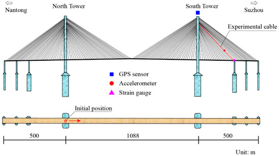 A special cable A18 in the south side span (downstream side) was chosen as the experimental object, as re-marked with red color in Figure 12. Specifically, the length and mass per unit length of the cable are 336.811 m and 77.70 kg/m, respectively. These cable parameters were measured in the construction stage []. The experimental cable connects the tower and the main girder at the auxiliary pier. A series of strain gauges have also been installed at the bottom of the cable. The measured stress is a reference to validate the proposed method.