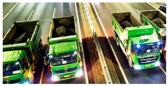 In contrast to the loading experiment in the workshop, the moving loads were adopted in the field experiment instead of the static loads. The photograph of the loading trucks is shown in Figure 13. In particular, four trucks full of sand and stones were used as applied loads in the dynamic test. The trucks started from the North Tower and moved towards the South Tower at a constant designed speed of 30 km/h (Case 1) and 40 km/h (Case 2), respectively.