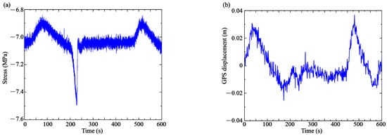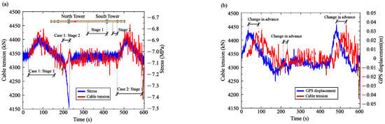 Limited to the in-service conditions, it is difficult to install a load cell or other sensors on the cable to acquire the cable tension directly. In this situation, a GPS sensor and a strain gauge were installed on the top of the South Tower and the girder near the bottom of the experimental cable as a reference, respectively. Stress was calculated from the strain data based on the calibration in the construction stage. The sampling frequencies of the GPS sensor and strain gauge are 1 Hz and 20 Hz, respectively. The GPS displacement of the tower and the stress of the girder are shown in Figure 15a,b, respectively.