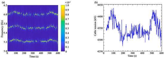 The dynamic response was used to identify the tension based on the proposed algorithm. Firstly, the time-varying frequency of the acceleration signal was extracted using TFR techniques. The window function in STFT was also chosen as 256 based on the discussion in the workshop experiment. Moreover, the best identification range is between 5.0 to 7.0 Hz. Thus, the 15th, 16th, and 17th frequencies of cables were identified clearly from the reassignment spectrogram, as shown in Figure 16a. It is clear to see from Figure 16a that the structural frequency changes more frequently than the results of the workshop environment. Moreover, the identified time-varying frequency was used to calculate the tension by the 15th order frequency based on Equation (12), as shown in Figure 16b.