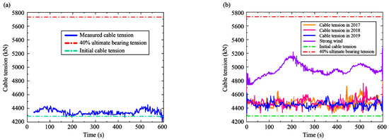The identified cable tension can also be used to reflect the deterioration or abnormal conditions of cables. Firstly, the time-varying tension is identified at 12 o’clock on March 31 from 2017 to 2019, as shown in Figure 18b. The identified tensions in 2017, 2018, and 2019 are marked with orange, pink and blue colors, respectively. The average values of these three years are all about 4500 ± 150 kN. The cable tension is mainly controlled by the moving loads. The operating condition of the cable is pretty healthy, and no obvious deterioration is found. Then, an abnormal condition is chosen to show the applications of the proposed algorithm during a strong wind in the summer of 2018, as marked with purple color in Figure 18b. The maximum wind speed at the height of the tower is more than 50 m/s during this server tropical storm. The cable tension increases to about 5100 ± 50 kN, much greater than the initial cable tension of 4284 kN. Fortunately, the cable tension remains within the designed 40% ultimate bearing tension of 5732 kN, showing that the service performance of the cable is under safety conditions.