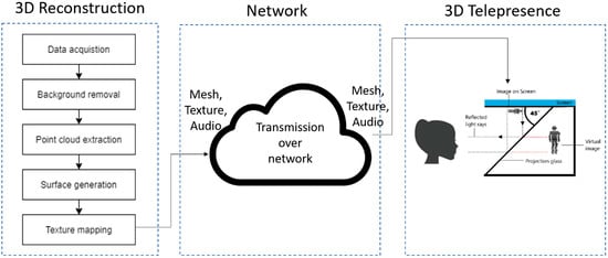 19], became widely available at low cost and were capable of acquiring video images as well as per-pixel depth information and were accessible, the total amount of studies and developments related to 3D reconstruction merged with telepresence systems increased substantially [