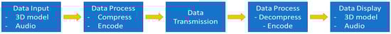 30] findings. After the 3D-textured model of the local user has been reconstructed, the 3D data such as mesh and texture along with the audio of the local user will be compressed and transmitted across the network to the remote site after being assembled in a UDP packet. When the packet is received in the remote client site, the packet will be disassembled and the data will be decompressed before being displayed on the remote user’s PC. The experiment will not use green screen settings as it did in the present case [