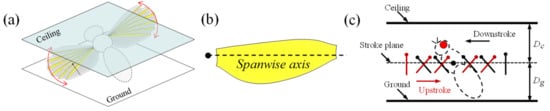 (a) Schematic motion of the wing between the ceiling and the ground, a wing model is shown as an insect; (b) wing’s planform shape; and (c) side view of a wing section’s motion. The black dot indicates the wing base, and and mean the ceiling clearance and the ground clearance, respectively. In this paper, = = . The position of the section on the wing is shown in (a).