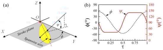 The kinematics of the wings implemented in our study is referred to as “normal hovering” which is a simplified model of the actual insect wing kinematics with a horizontal stroke plane. The spanwise axis of the wing, which connects the wing base to the wing tip, rotates about the wing base in the stroke plane reciprocally, and at the same time, the wing flips around the spanwise axis (see Figure 2a). Following the conventional naming methods, the forward and backward motions are called the downstroke and the upstroke, respectively. In Figure 2a, two independent angles, and , are defined to describe the wing motion relative to the wing base. means the stroke position angle, and means the rotational angle. In the inertial frame , the origin coincides with the wing base and the plane overlaps with the stroke plane. is the angle between the spanwise axis and Y-axis (Figure 2a). Time variation of is given by: