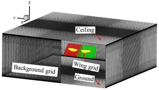 The wing grid’s dimensions for this work were 54 × 99 × 86 normally, around the wings and spanwise directions, respectively, where the thickness of the first-layer was 0.001. As it moved away from the wing surface in the normal direction, the grid spacing increased by a ratio of about 1.46. The X, Y, and Z-directional dimensions for the background grid were 115 × 115 × 74, respectively (the number of Z-directional points were changed because of the ceiling and ground vicinity). The wing grid’s outermost cylindrical boundary had a 2.5 radius, with the center point at the wing’s spanwise axis. The grid also extended in the spanwise direction from both the wing root and the tip to a 1.5 distance. The distances between the background grid boundaries and the wing root in the X and Y directions were 20, while in the Z-direction, they varied with the ceiling and ground distances. For the calculations, a 0.02 time step () was used. Variables such as time step, domain size, first layer thickness and mesh dimensions have already been tested [31], so the suitable values for these variables (stated above) were used directly in this study.