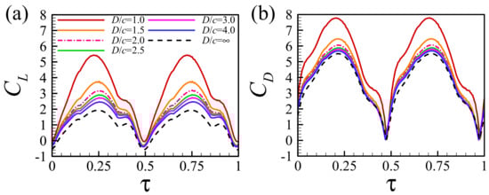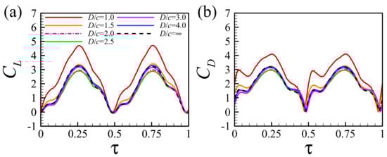 The transient aerodynamic (a) lift and (b) drag coefficient ( and ) distributions for one flapping cycle at systematic wall clearances () and .