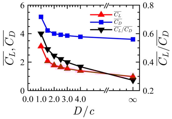 Cycled-averaged lift () and drag () coefficients and lift–drag ratio () versus wall clearance () at .