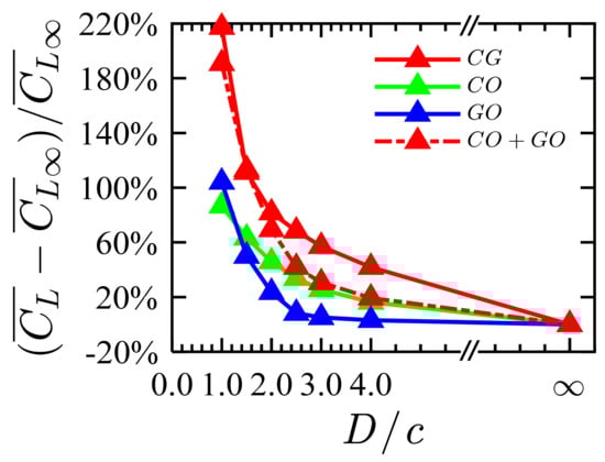 The relative increment of cycled-averaged lift coefficient relative to the = ∞ case (expressed as ) at . , , and represent the combined ceiling and ground case, the sum of the ceiling-only case and the ground-only case, the ceiling-only case and the ground-only case, respectively.