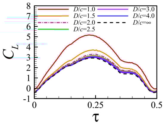 Referring to Figure 4 again, which shows the force curves after the periodicity has been established, it is noted that the lift coefficient () at = 4.0 becomes larger than that of = ∞. Since the narrow-channel effect is not functioning at = 4.0, the force enhancement at this wall clearance, after the vortex wake is fully developed, can be attributed to the restriction of the wall on the development of the vortex wake and the associated downwash (discussed below). Note that all the results in the remaining section discuss the fourth flapping cycle.