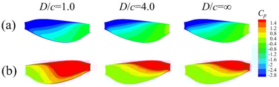 Figure 8 plots the surface pressure () distributions in the middle of the first downstroke ( = 0.25) when there is no vortex wake at = 1.0, 4.0 and ∞. Observing Figure 8, it is found that the = 1.0 case exhibits both the largest negative pressure zone area on the upper surface and positive pressure zone area on the lower surface among the three cases. For the = 4.0 case, the pressure on both sides is approximately the same as = ∞, which is consistent with approximately the same aerodynamic forces shown in Figure 7. Again, this confirms that the narrow-channel effect is insignificant at = 4.0.