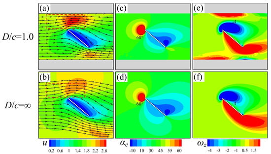 The streamlines and velocity () contours relative to the wings (a,b), the effective angle of attack () contours (c,d), and the spanwise vorticity () contours (e,f) in the middle of the first downstroke () at . The first row is for = 1.0, and second row is for = ∞.