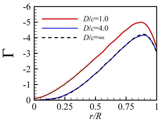 Figure 9a,b show the streamlines relative to the wings, along with the incoming flow velocity () contours on the 2/3 spanwise slice in the middle of the first downstroke ( = 0.25), for the = 1.0 and ∞ cases ( = 4.0 is almost the same as = ∞, so is not shown here). Judging from the density of the streamlines and the velocity contours, especially in the squared area, the velocity of the incoming flow of = 1.0 is larger than that of = ∞. This is because a narrow channel was formed between the leading edge of the wing and the ceiling. Based on the directions of the velocity vector, the effective angle of attack () of the wing was also calculated and is shown in Figure 9c,d. Comparing the contours for the two cases, it is seen that the effective angle of attack of the = 1.0 is larger than that of = ∞. This can easily be seen by comparing the surrounded area of the same contour line with the value of in Figure 9c,d. With a larger incoming velocity and effective angle of attack, the wing would produce a larger LEV. This is validated by the fact that the area of negative spanwise vorticity () at = 1.0 is larger than that of = ∞, as shown in Figure 9e,f. This helps to explain the larger negative pressure on the upper wing surface in Figure 8. The corresponding circulation of the LEV calculated in Figure 10 also shows the consistency, with the circulation along the wingspan for = 1.0 being larger than that of = ∞. Here, the increase in the incoming flow velocity and angle of attack in Figure 9 may also be regarded as the result of the existence of an image LEV, as explained in Ref. [31], which studied the ceiling-only effect. The classical image approach was also employed in Ref. [17] to study the ground effect for a fixed-wing. This classical method is based on the linear potential theory. Thus, it should be applied cautiously in the analysis of a wall effect for unsteady motion at a high angle of attack. In addition, the wake vortex, which is hard to convect downstream in hovering flight, is one of the main factors affecting the aerodynamics of a flapping wing. The application of the image method to a flapping wing will be more complex than to a fixed wing, because it is necessary to simulate the image’s leading-edge vortex and all the shedding wake vortices at the same time.